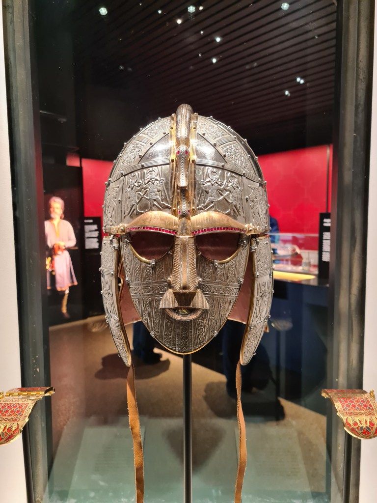 On the cover of my school history textbook was a photograph of a jewelled purse lid of gold and garnets – one of the treasures of the Sutton Hoo Ship Burial. Later, studying history at university in London, I spent many afternoons in the British Museum, staring at all the objects from Sutton Hoo, marvelling that such intricately decorated objects such as the shoulder clasps, belt buckle and helmet were produced during the period known as the ‘Dark Ages.’ The helmet, with its garnet-encrusted eyebrows, held a particular fascination.