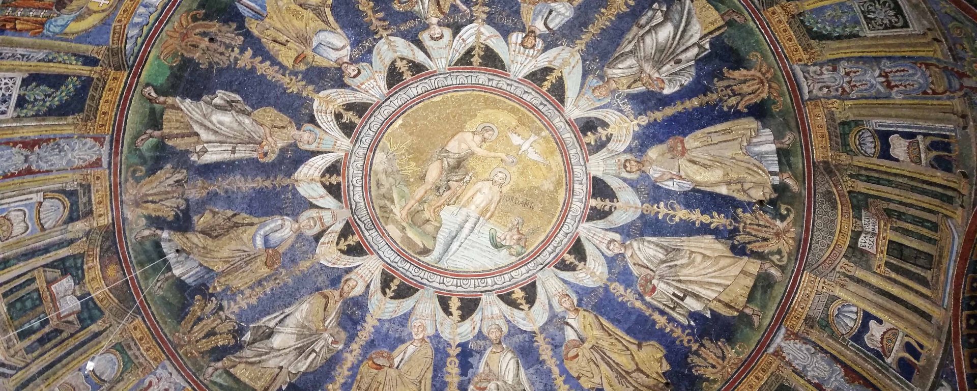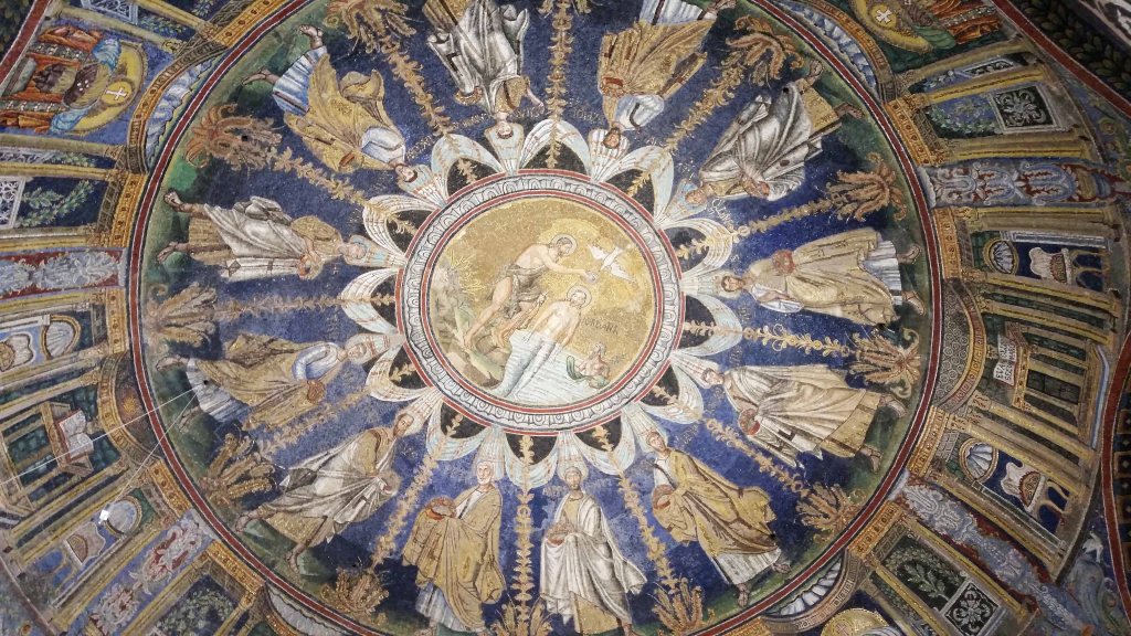 Next we visited the Arian Baptistery. This was built in the late fifth century as the baptistery of the Arian Cathedral, at a time when Arianism was the official court religion of the Ostrogothic rulers. The baptistery was re-consecrated in the Orthodox tradition in 561. The only surviving mosaic decoration in the interior is in the dome, which shows the baptism of Christ.
