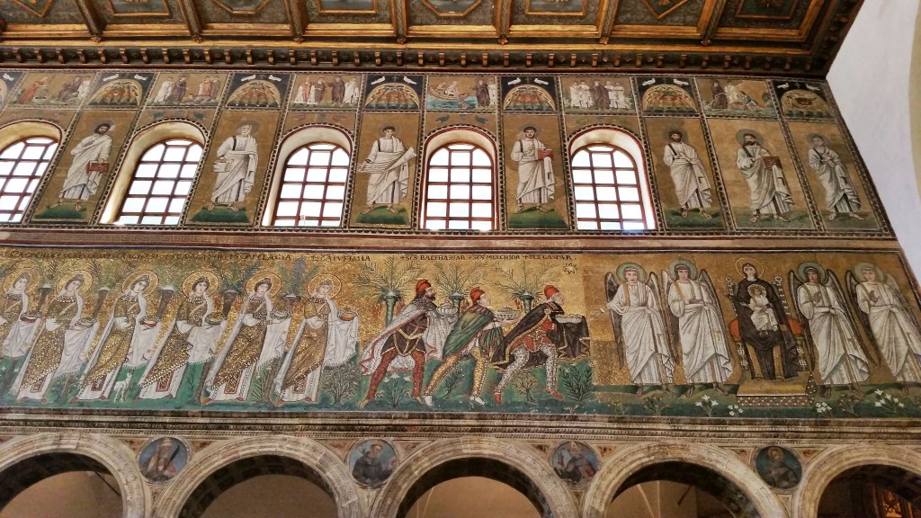On arrival, we went first to St Apollinare Nuovo, and purchased a ticket giving admission to five of the UNESCO World Heritage sites for €9.50. The church was built in the late 5th or early 6th century on the order of Theoderic, and was originally intended for Arian worship. Arianism was a heretical doctrine which disputed the divinity of Christ and thus disagreed with the view of the Trinity as God in three persons. After 540, when the city was occupied by the Byzantines, all the Arian buildings were taken over by Catholics, and the church was rededicated to St Martin of Tours. The current name originates in the mid-ninth century, when the relics of St Apollinare, the first bishop of Ravenna, were ostensibly moved there from the basilica of St Apollinare in Classe. It was called St Apollinare Nuovo to distinguish it from a smaller, older church in the city also dedicated to St Apollinare.