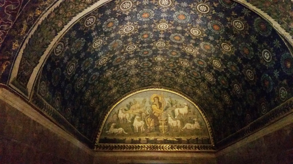 Nearby is the Mausoleum of Galla Placidia, the daughter of Theodosius I. Built in the second quarter of the fifth century it is one of the oldest monuments of its kind, and its mosaics are the oldest in Ravenna. They are rather different from the others, as the artistic style is Roman rather than Byzantine. I was particularly struck by the midnight blue of the sky and the depictions of pairs of deer. Galla Placida had a very interesting life. She married twice, firstly to a barbarian called Ataulf, and later to Constantius III, with whom she had two children, Honoria and Valentinian. She ruled Ravenna for many years, as empress, and later as regent for her son Valentinian. Despite the name, her remains were never housed in this mausoleum. She died in Rome and is buried in the Theodosian mausoleum there.