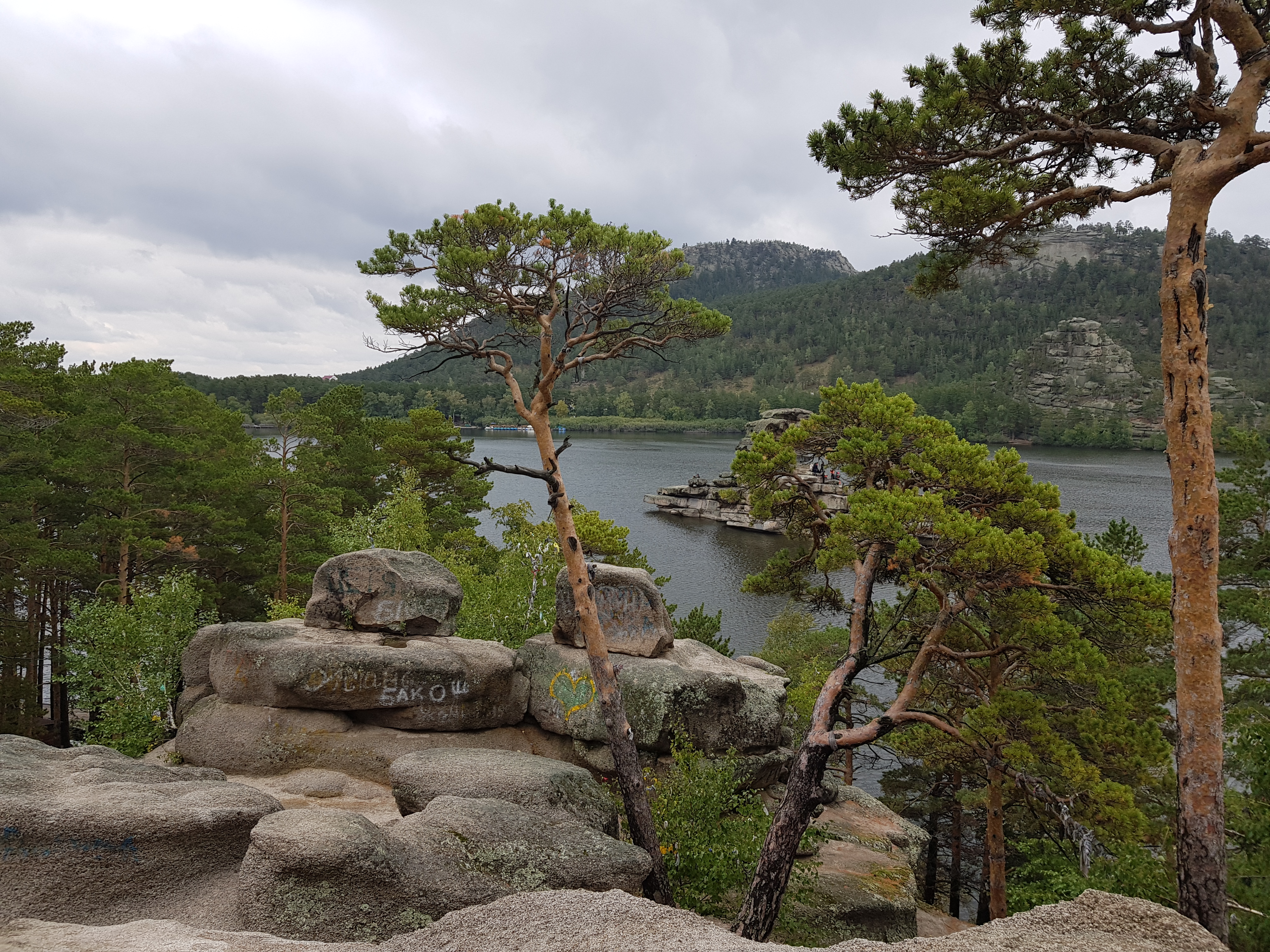 Despite the rather misty weather, I climbed up to a viewpoint with Olyssa, whilst my husband Neil decided discretion was the better part of valour and stayed behind to commune with a woodpecker. The wooden steps that that had been built to help with the climb had only been built this year, according to Olyssa, but already some were missing. Initially it was so misty at the top that all I could see was the strange granite rock formations around me, one of them resembling a table and chairs. Fortunately, the mist cleared enough after a while to be able to see Lake Borovoye and a mountain which Olyssa said was shaped like an elephant. I wasn’t sure I could see any resemblance to a pachyderm, but at least I could see the mountain.