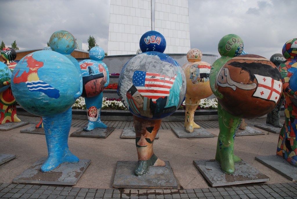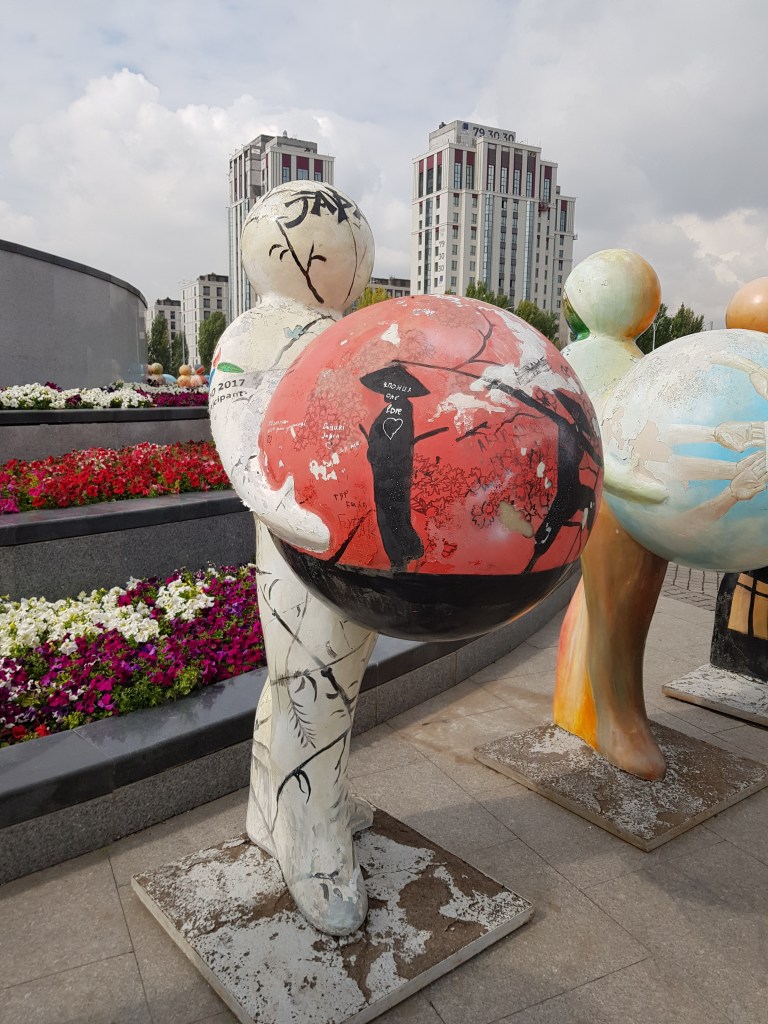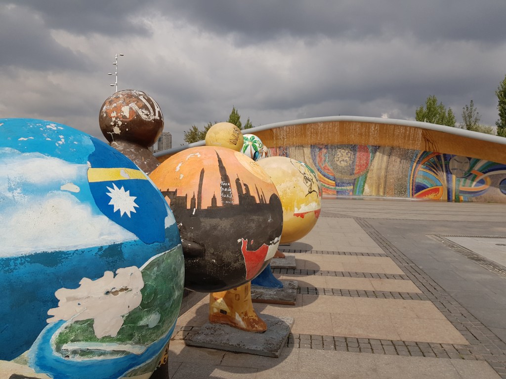 In the Central City Park in Nursultan is a colourful monument comprising figures bearing globes painted to represent the countries of the world, originally created for the 2017 Expo. It’s fun to walk round spotting the countries you have visited, and wincing at the cliche of the UK’s London bus and Union Jack livery.