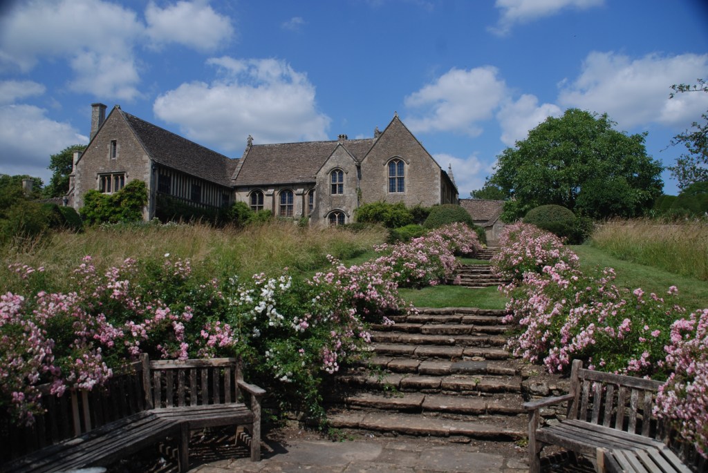 The gardens were designed on Arts and Crafts principles by Alfred Parsons RA and his business partner Captain Partridge to complement the restoration of the Manor for Robert Fuller (the donor to the National Trust) by the architect Sir Harold Brakspear FSA. The design was done over a four year period from 1907 to 1911. Recently the gardens have been gradually replanted under the guiding eye of Patsy Floyd (a member of the donor family and the National Trust’s tenant) using palettes of colours sympathetic to Parsons’ designs. There is a beautiful blue and yellow herbaceous border by the church. An interesting feature are the topiary pavilions: shaped like jelly moulds: they are large enough to stand inside for shade or protection from rain, depending on the weather.
